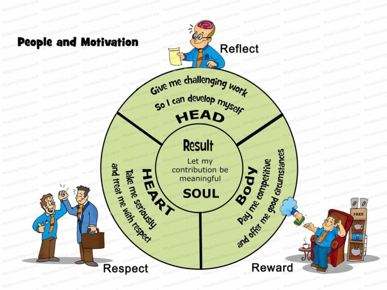 Mensen worden gemotiveerd in het werk door ze te prikkelen en verrijken in het Hoofd, Hun Hart, het Lichaam en de Ziel. Reflectie, Respect en Beloning leiden uiteindelijk tot een mooi resultaat